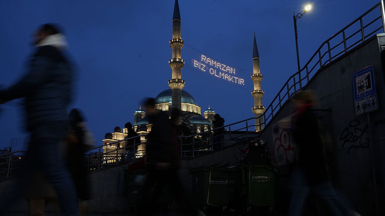 Sahur hazırlıklarına saatler kala dron ile kaydedilen görüntülerde, minareler arasına asılan mahyaların şehrin tarihi dokusuyla bütünleştiği görüldü. Süleymaniye Camii’nde “Ramazan Kur’an Ayıdır” yazılı mahya semaları süslerken, Yeni Camii’nde de minareler arasına ‘Ramazan biz olmaktır’ yazıldı. Ramazan ayı boyunca İstanbul’daki camilerde beş farklı mahya yazısı yer alacak.