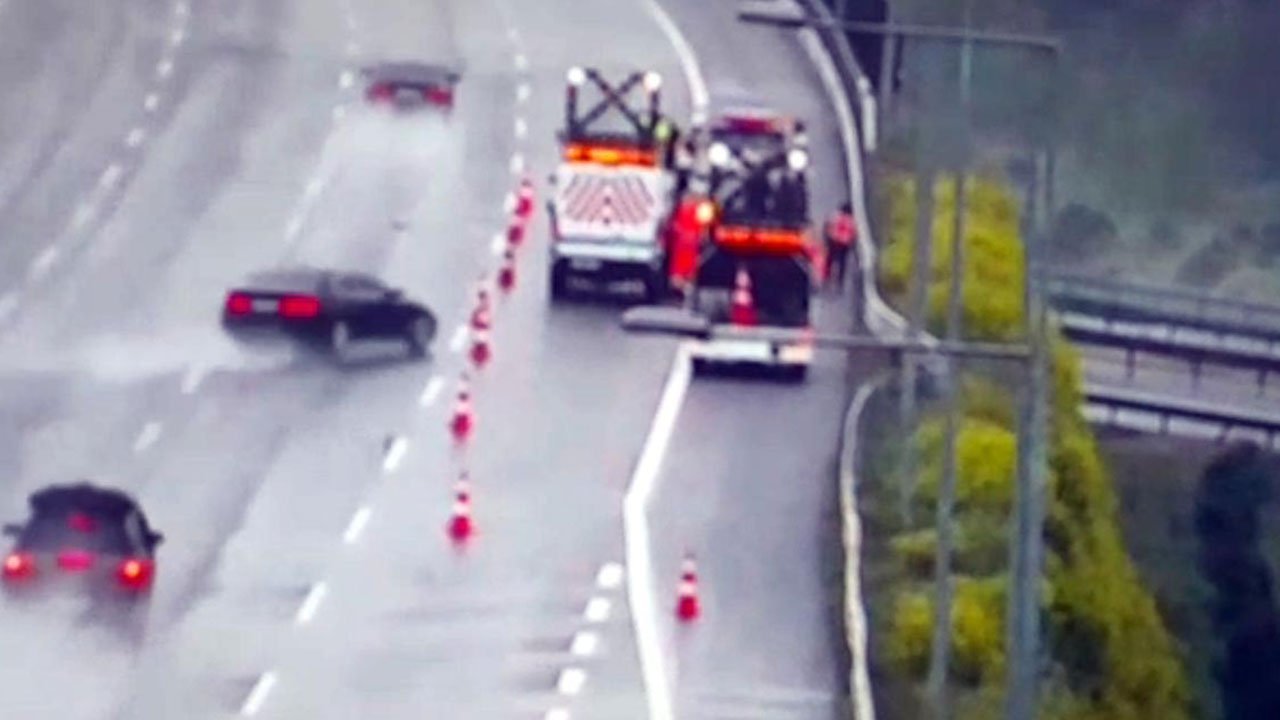 Sakarya’nın Akyazı ilçesinin Kuzey Marmara Otoyolu geçişinde sürücüsünün kontrolünü yitirdiği otomobil, Karayolları ekibine çarptı. 2 işçi ile otomobildeki 1 kişinin yaralandığı kaza, güvenlik kamerasına yansıdı.